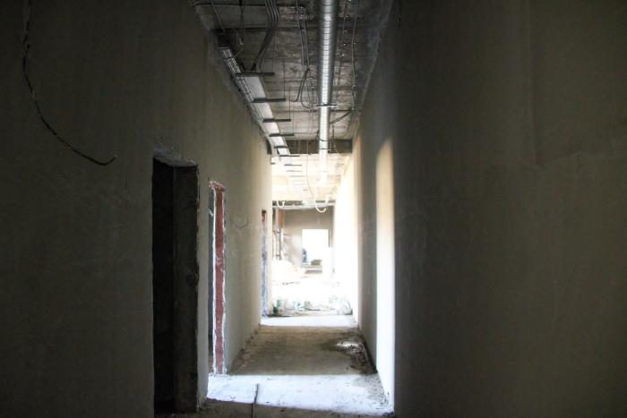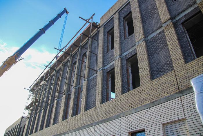 Строители завершили кладку внутренних перегородок и стен на всех этажах строящегося здания. Продолжают кладку облицовочного кирпича 3-го этажа. Завершают устройство резервуаров ливневых вод.